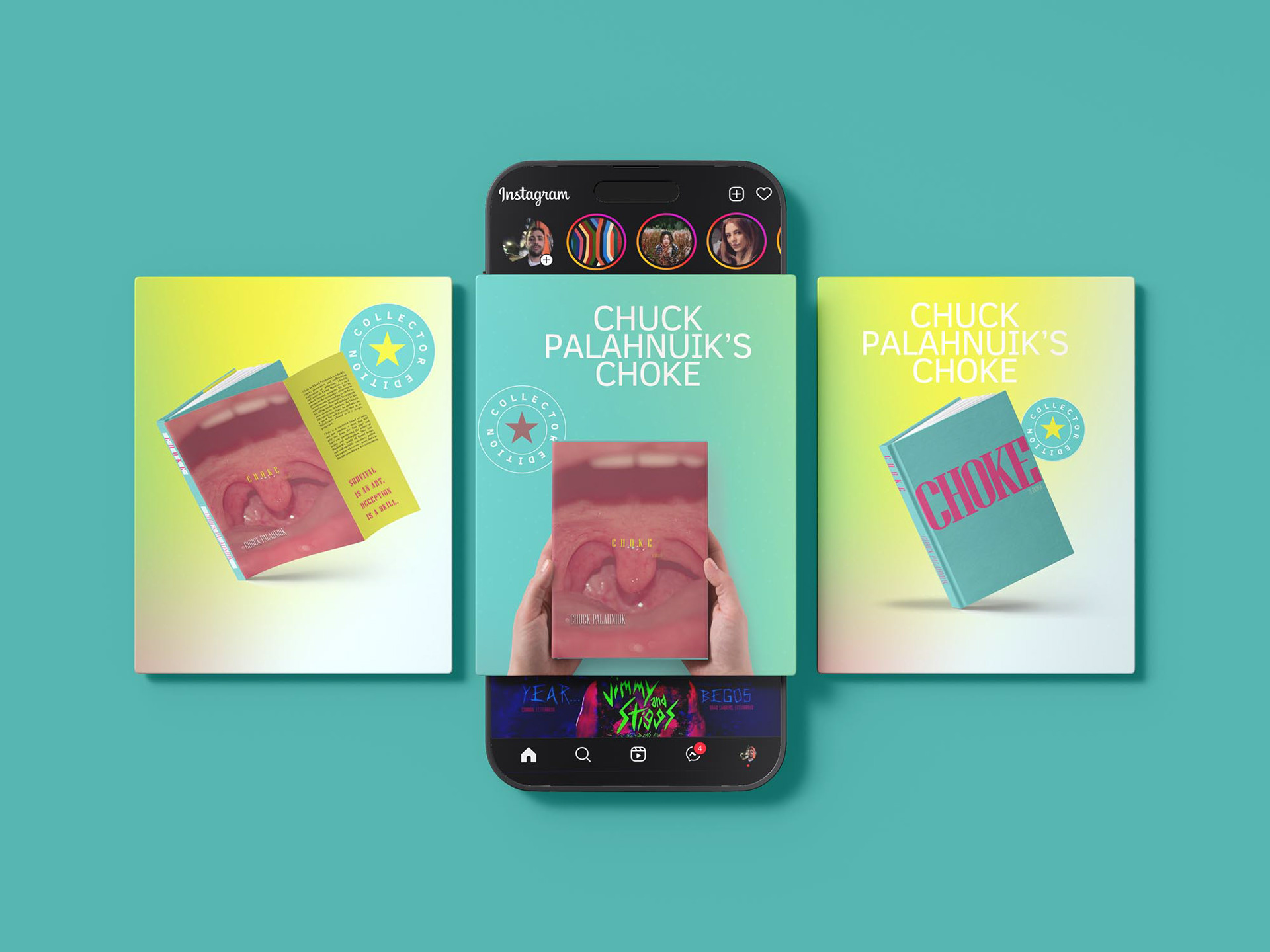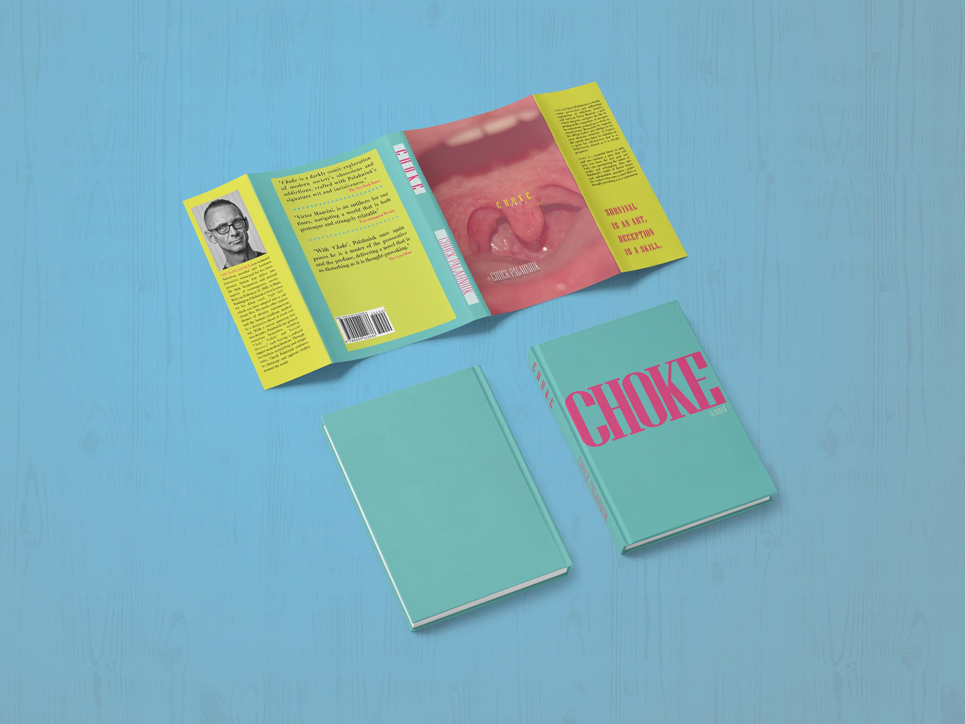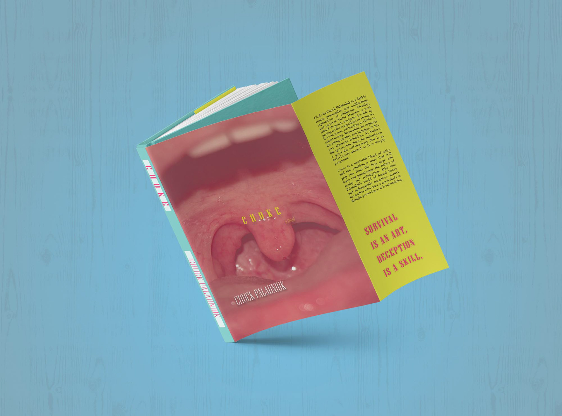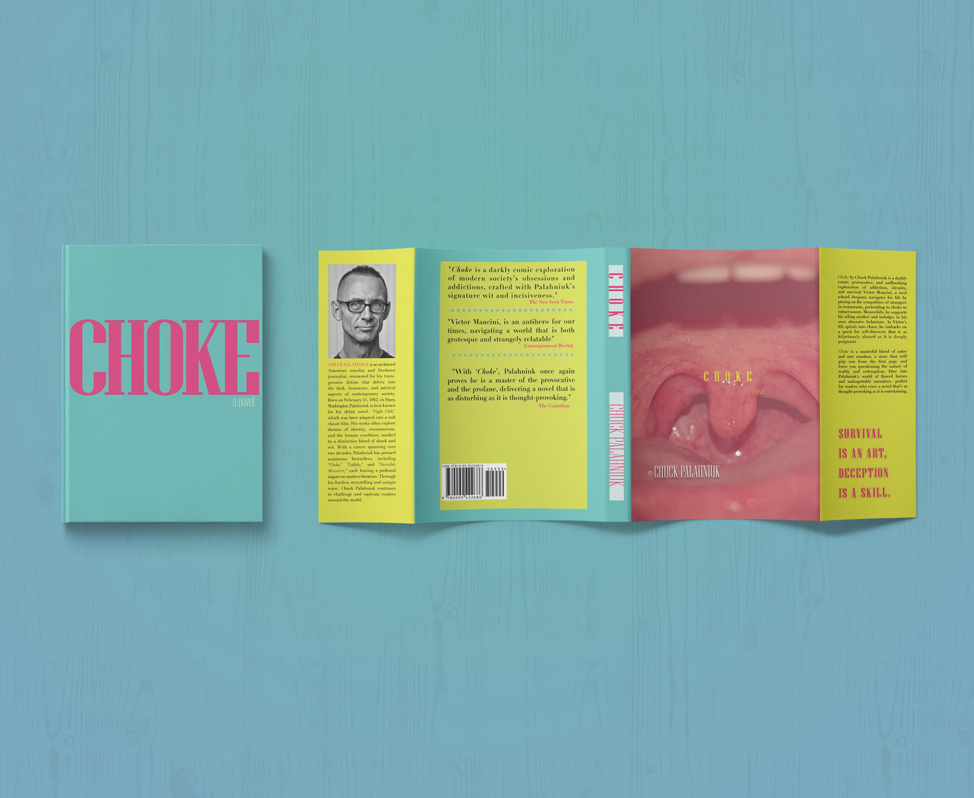 This conceptual book cover and dust jacket design for Choke embraces a raw, provocative aesthetic that reflects the novel’s dark humor, themes of self-destruction, and satirical edge. The close-up of a mouth serves as an unsettling yet compelling visual, reinforcing the book’s exploration of addiction and compulsion. A vibrant cyan and yellow color palette contrasts sharply with the visceral imagery, adding an ironic playfulness that mirrors Chuck Palahniuk’s signature tone. The bold, condensed typography enhances the chaotic energy of the narrative, ensuring the design feels as provocative as the story itself. The dust jacket design extends this bold aesthetic, featuring critical reviews, a strong typographic hierarchy, and a striking back flap statement: “Survival is an art, deception is a skill.” Together, these elements create a visually arresting and conceptually rich interpretation of the novel, balancing discomfort and intrigue to draw readers into its unfiltered world.